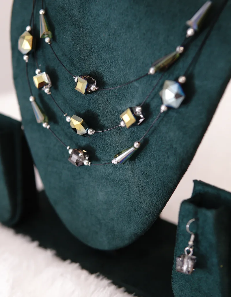 Each layer is arranged in a tiered sequence that enhances depth without creating heaviness. The beads are selected for uniform colour, smooth texture, and consistent shine. In addition, the metal components include a tarnish-resistant coating, which maintains the colour and finish even with repeated use.
