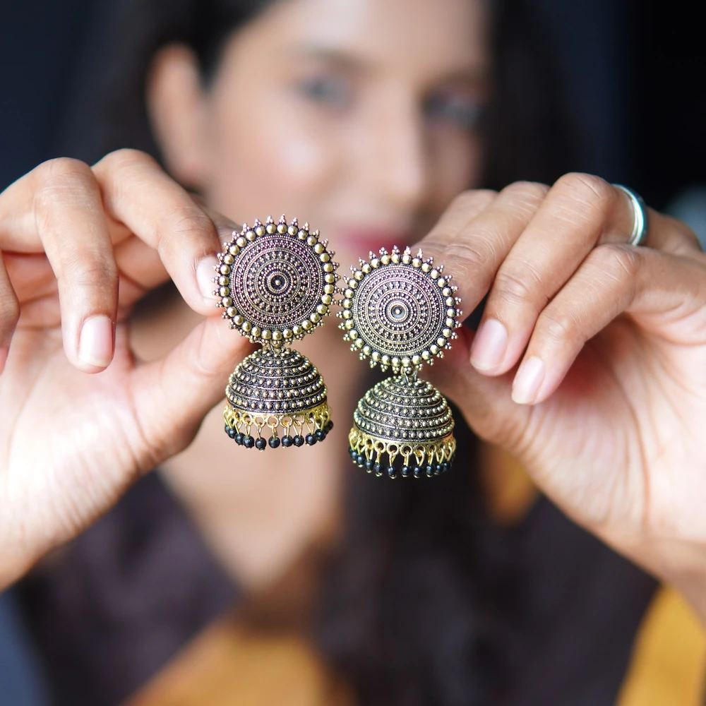 These golden and black jhumkas complement a wide range of outfits — from traditional sarees and lehengas to Indo-western attire. Transitioning from day events to evening functions is effortless with this versatile pair. Their timeless design and intricate craftsmanship make them a thoughtful gift for someone who appreciates authentic, handcrafted jewellery.
