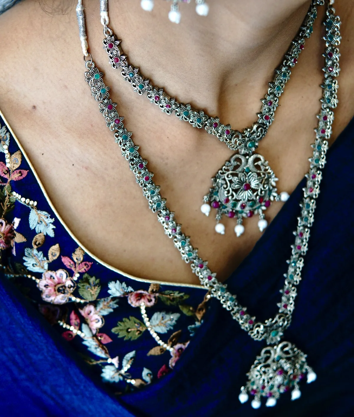 This layered necklace set is specially designed for festivals and dance celebrations. You can wear it for Navratri, Garba nights, Dandiya Raas, cultural programmes, and themed parties. Furthermore, it pairs exceptionally well with chaniya choli, ghagras, mirror work outfits, and colourful kurtis. As a result, it becomes a must-have accessory for festive wardrobes that demand energy, colour, and traditional flair.