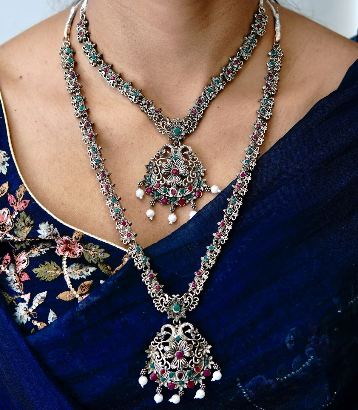 This jewellery set includes two perfectly balanced necklaces – one short and one long – that create an elegant layered effect. Skilled artisans carefully handcraft each element using traditional motifs inspired by tribal and folk jewellery. In addition, the oxidised surface gives the set its distinctive rustic character, making it ideal for women who love strong, expressive ethnic accessories. The matching earrings complement the layered structure beautifully, ensuring a coordinated and powerful look.