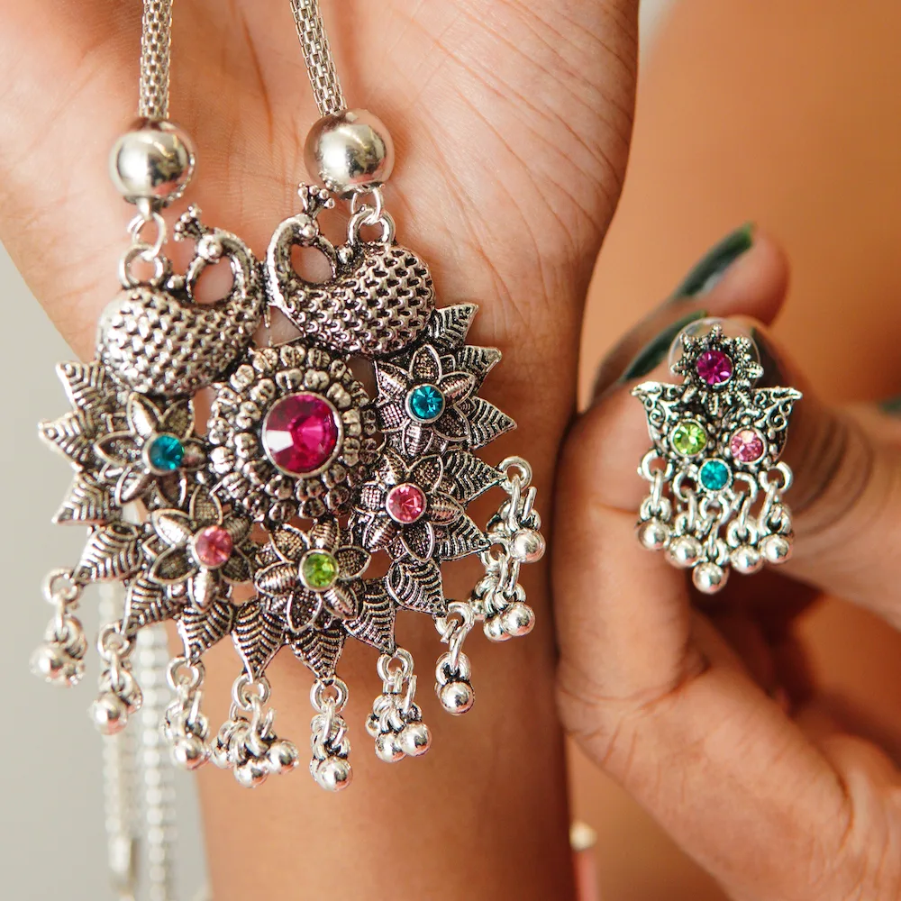 Crafted with precision, this statement necklace showcases unique tribal patterns and motifs that reflect cultural artistry. Its versatile design allows women to pair it with multiple outfits, creating different looks for various occasions. The oxidised finish adds authenticity and durability, making this set a timeless addition to your jewelry collection.