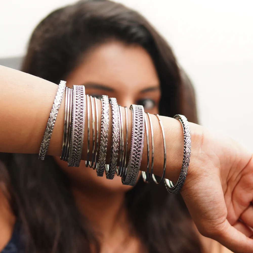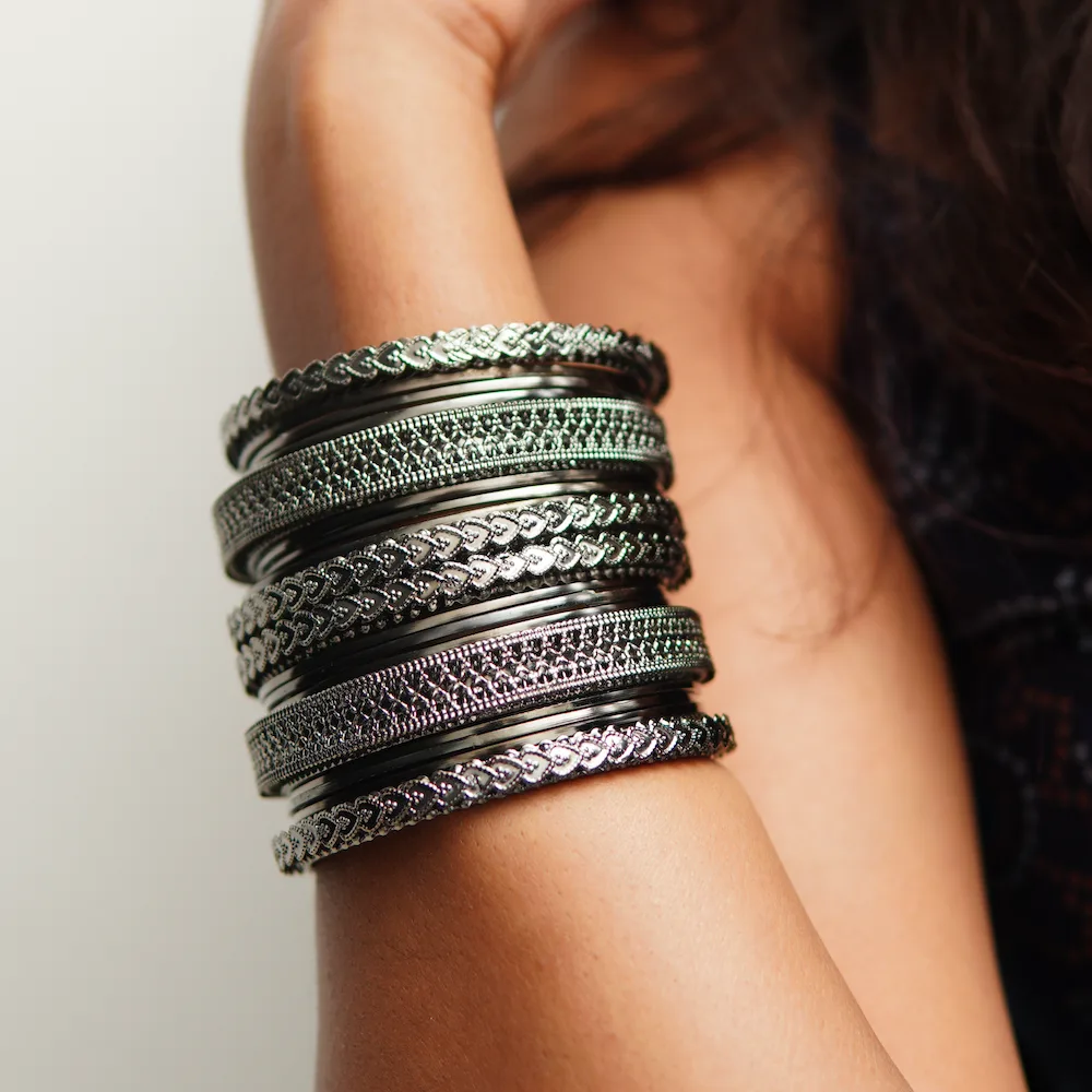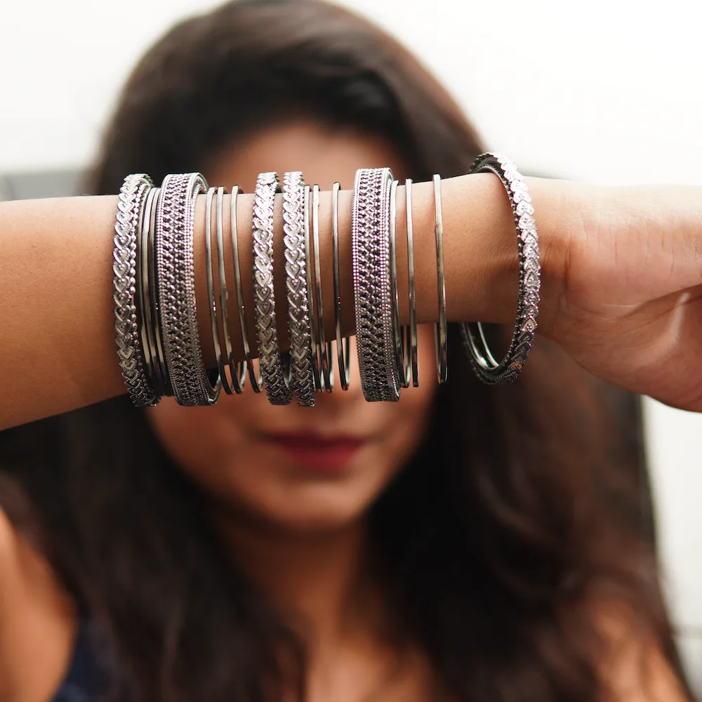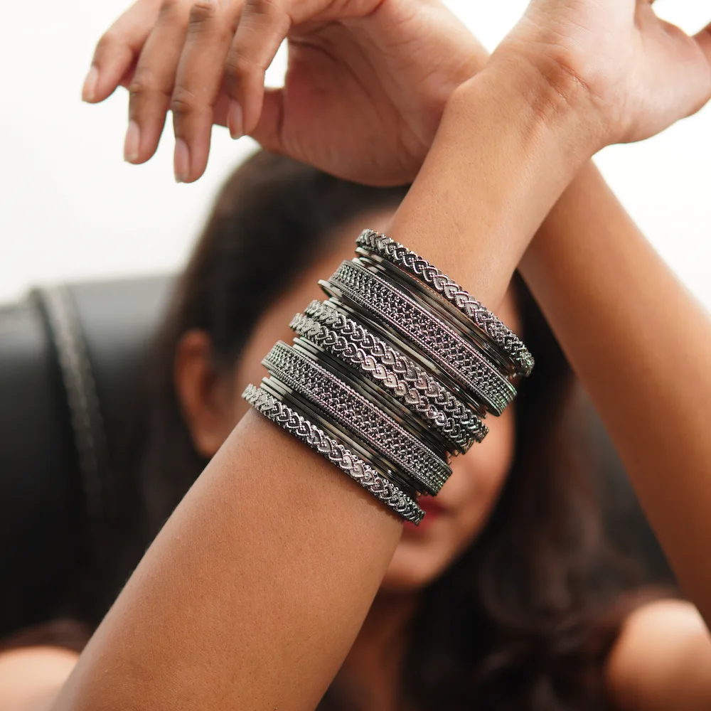 Add timeless charm to your jewellery collection with this exquisite set of handcrafted oxidised bangles from Huviena. Designed for women who appreciate ethnic beauty with a modern twist, these bangles capture the spirit of traditional craftsmanship in every curve and pattern. Their antique silver finish adds a touch of sophistication that pairs beautifully with both festive attire and everyday outfits.