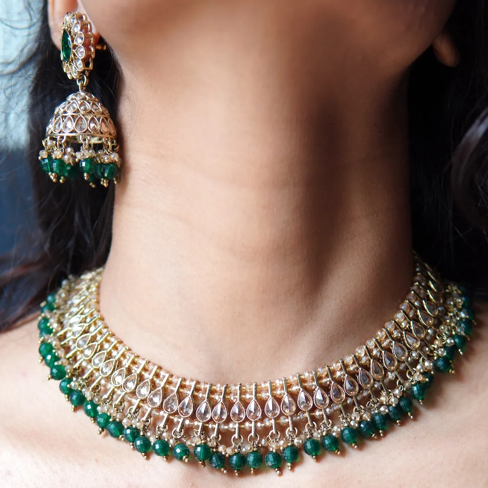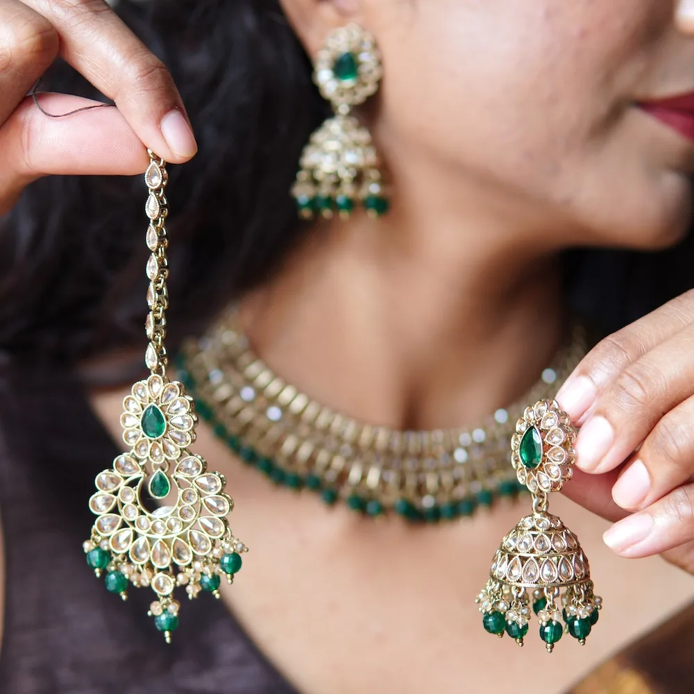 Each necklace in this set is handcrafted by skilled artisans who pay close attention to precision and quality. The brilliant green stones are carefully placed to create a vibrant contrast against the golden base, resulting in a regal yet balanced design. Because of this thoughtful detailing, the set stands out as a timeless expression of grace and sophistication.
